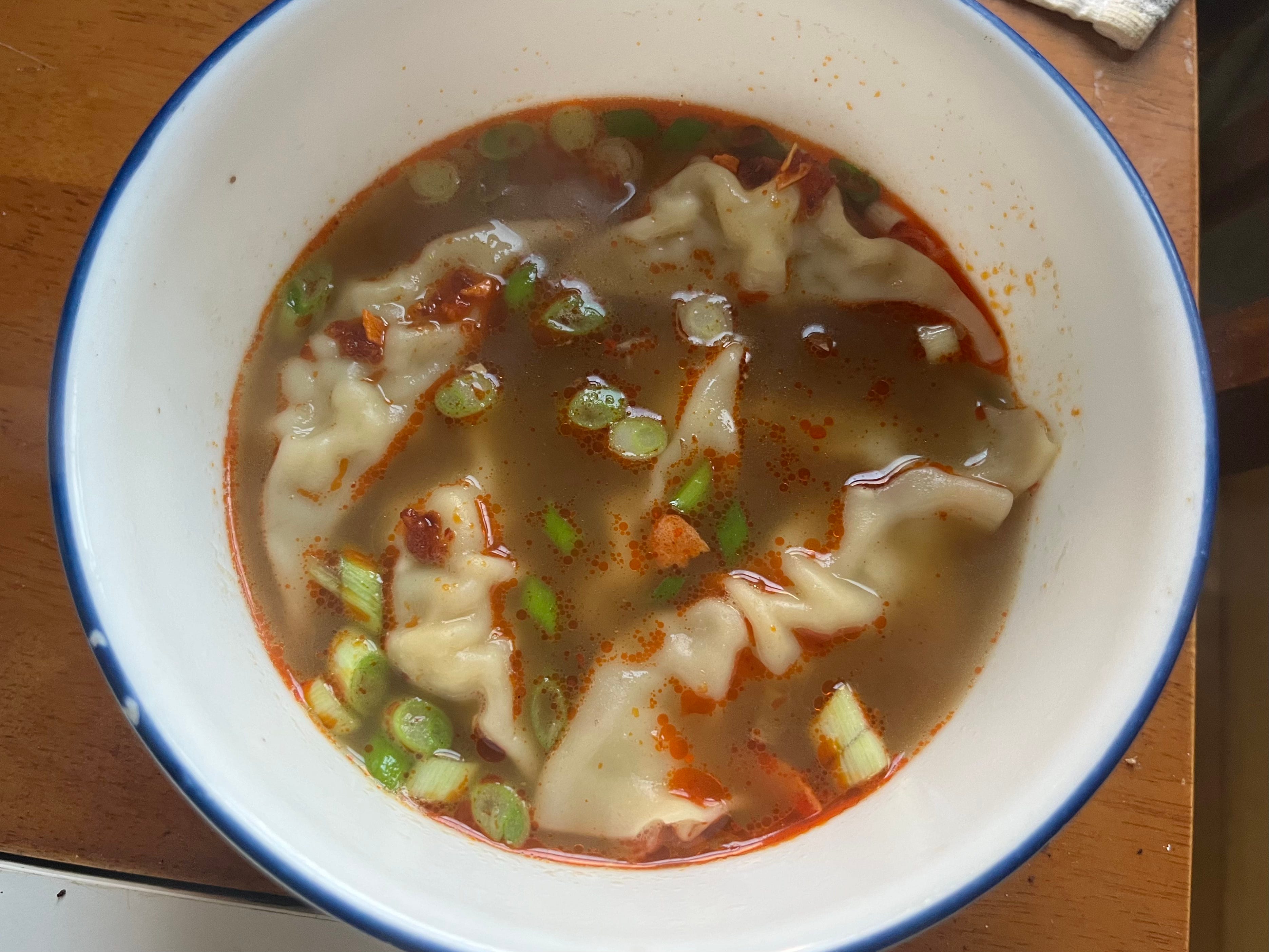 (Frozen dumplings cooked in chicken broth with garlic, ginger, scallions, sesame oil, and chili crisp. The perfect lunch, in my opinion.)